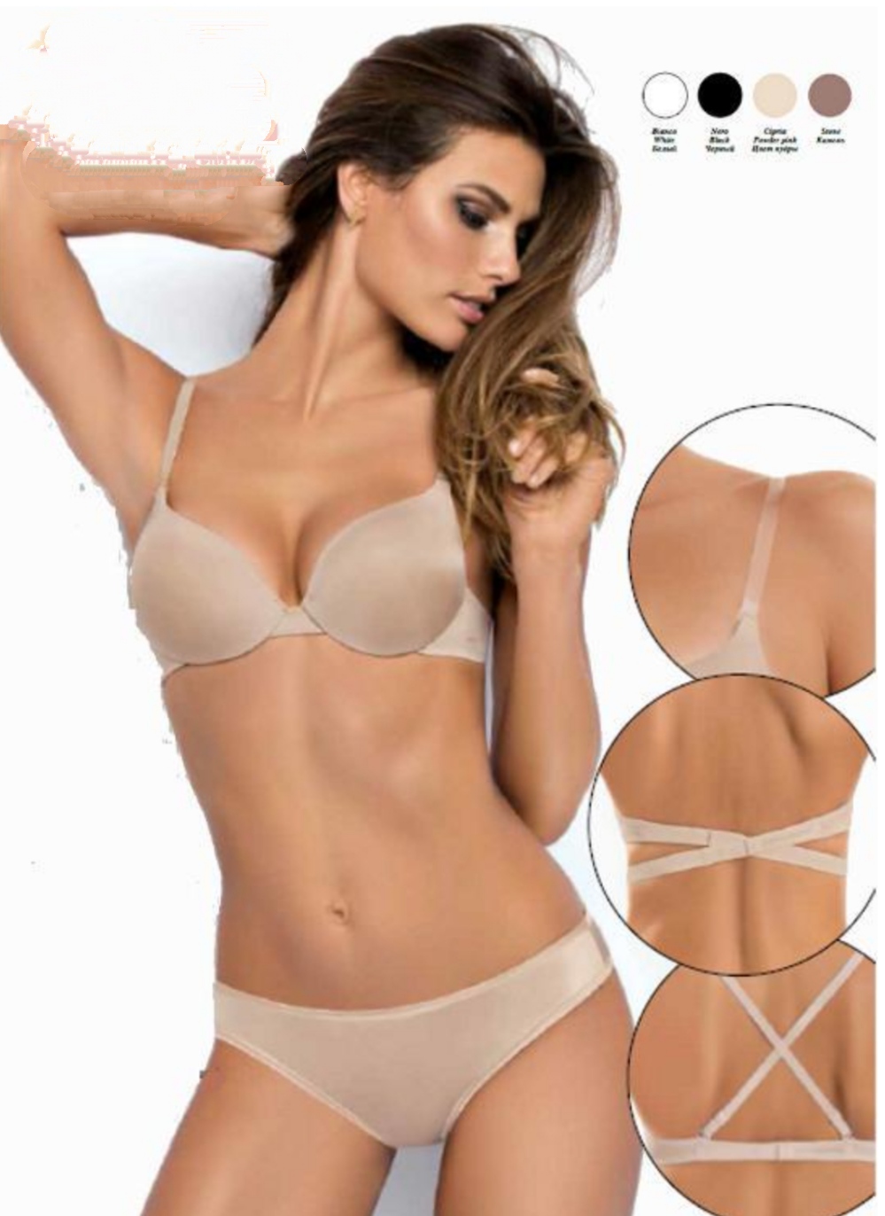 Si e lei σουτιέν με ενίσχυση και διάφορα κουμπώματα.Διαθετει μακρυες τιράντες που κουμπωνουν χαμηλά στη μέση για να μπορεί να φορεθεί άνετα με εξωπλατο ρούχο.Επισης έχει και τιράντες σιλικόνη.Απο microfibra που δεν διαγράφει